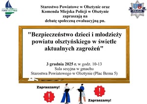 Przed nami debata społeczna "Bezpieczeństwo dzieci i młodzieży powiatu olsztyńskiego w świetle aktualnych zagrożeń". Spotkanie odbędzie się 3 grudnia 2025 r. w godzinach 10:00-13:00 w sali sesyjnej Starostwa Powiatowego w Olsztynie przy Placu Bema 5. Zapraszają Komenda Miejska Policji w Olsztynie oraz Wydział Bezpieczeństwa i Zarządzania Kryzysowego Starostwa Powiatowego w Olsztynie.