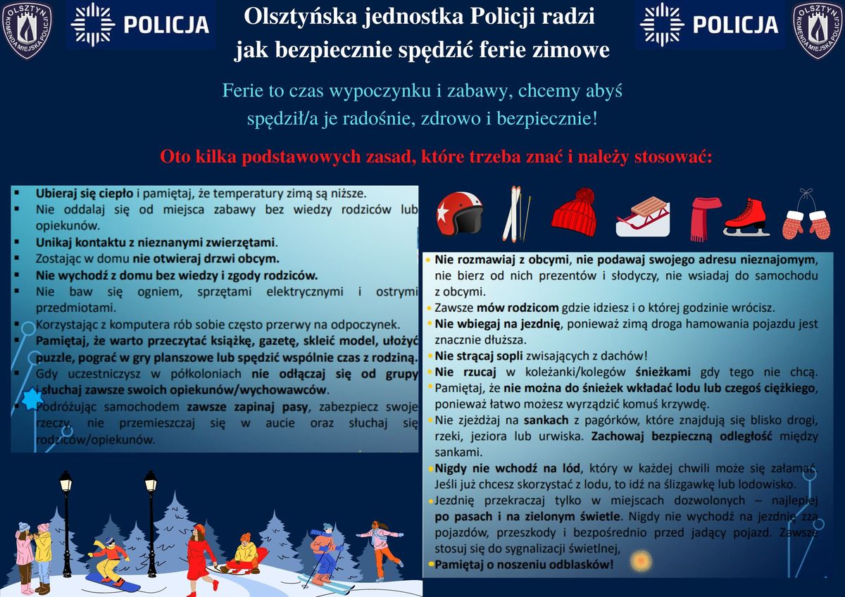 Olsztyńskim policjantom zależy szczególnie na tym, aby okres ferii (23.01.-05.02.2023 r.) był czasem bezpiecznym i radosnym dla wszystkich – dużych i małych. Oczywiście w sposób szczególny troszczymy się o najmłodszych, dlatego też policyjni profilaktycy przygotowali zbiór zasad i rad, jak bezpiecznie spędzić ferie zimowe i tym samym unikać zagrożeń.
