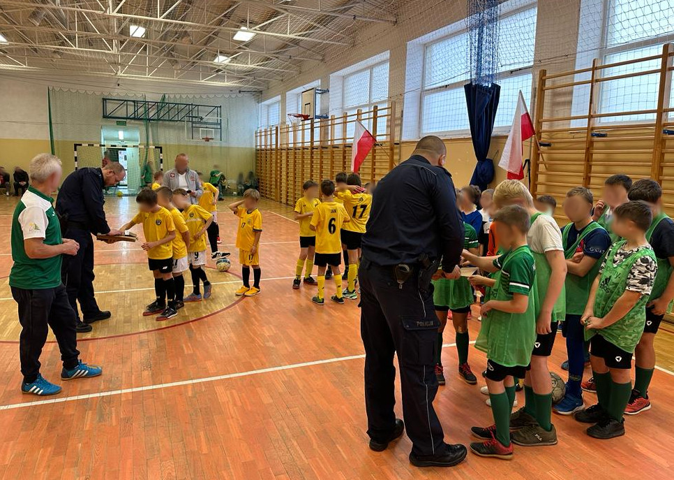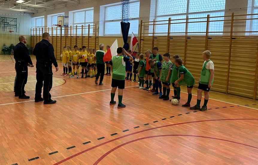 W sobotę (11.11.2023 r.) dzielnicowi z Posterunku Policji w Purdzie odwiedzili zawodników, którzy brali udział w XV Gminnym Turnieju Piłki Nożnej w związku z obchodami Święta Niepodległości, organizowanymi na hali sportowej w Marcinkowie. Dzieci miały okazję porozmawiać z policjantami o bezpieczeństwie na drodze do i ze szkoły. Funkcjonariusze podkreślali jak ważną rolę pełnią elementy odblaskowe. Dzieci bardzo chętnie odpowiadały na zadawane pytania i wykazywały się dużą wiedzą z zakresu bezpieczeństwa w ruchu drogowym. Świętowanie stało się też okazją do nauki i przypomnienia najmłodszym zasad bezpieczeństwa. Na koniec uczniowie mieli możliwość zadawania wielu pytań policjantom i z zainteresowaniem słuchały opowiadania o ich codziennej pracy.