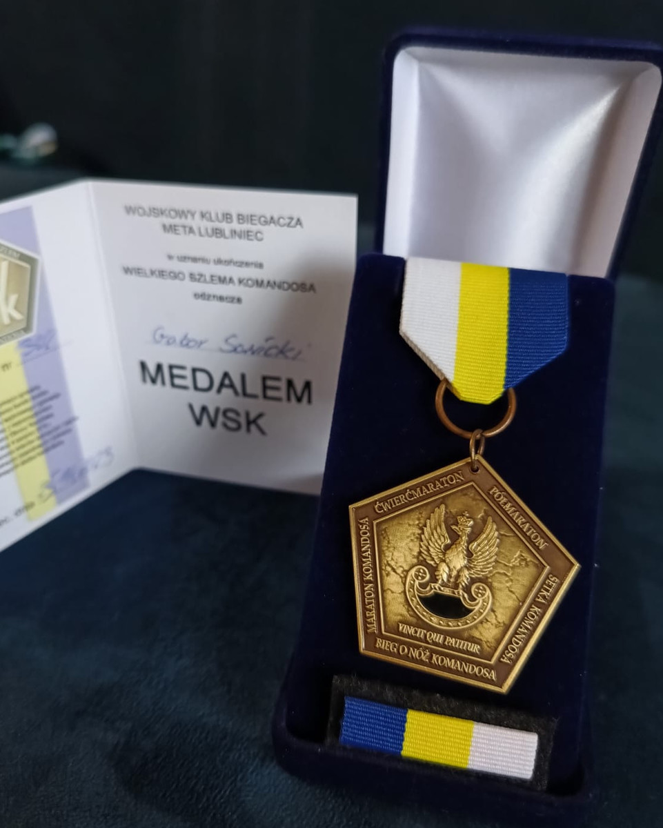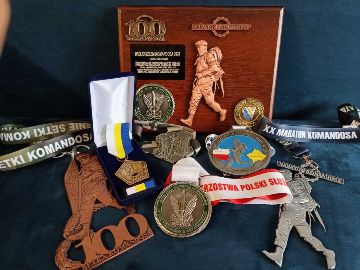 St.post. Gabor Sawicki na co dzień pełni służbę jako policyjny wodniak w Komendzie Miejskiej Policji w Olsztynie i potrafi połączyć pasję z codziennymi obowiązkami – bierze udział w licznych biegach i maratonach. Chociażby w sobotę (25.11.2023 r.) wziął udział w maratonie zorganizowany w Lublińcu, dzięki temu dołączył do elitarnej i nielicznej grupy osób, które otrzymały odznaczenie. Ten start był zwieńczeniem prestiżowego, niezwykle trudnego cyklu biegów pn. Wielki Szlem Komandosa. Nasz funkcjonariusz w ciągu jednego roku przebiegł 5 biegów z plecakiem ważącym 10 kg pokonując ponad 180 km (tj.: 10 km i 21 km biegu w umundurowaniu z 10 kg plecakiem, 100 km biegu – 20 km w umundurowaniu i z 10 kg plecakiem, 20 km w umundurowaniu oraz 60 km w stroju sportowym; w 10 km biegu w umundurowaniu oraz na zakończenie w 42 km biegu w umundurowaniu z 10 kg plecakiem). Wymagało to nie tylko doskonałej kondycji fizycznej ale i psychicznej. Nie każdy poradziłby sobie z takim obciążeniem, wysiłkiem fizycznym i długimi dystansami biegu. Nasz policjant ukończył go i z dumą może dołączyć do grona zwycięzców. Łącznie w całym cyklu biegów wystartowało około 600 osób, natomiast medalem mogło pochwalić się zaledwie koło 150, w tym policjant z olsztyńskiej jednostki policji.