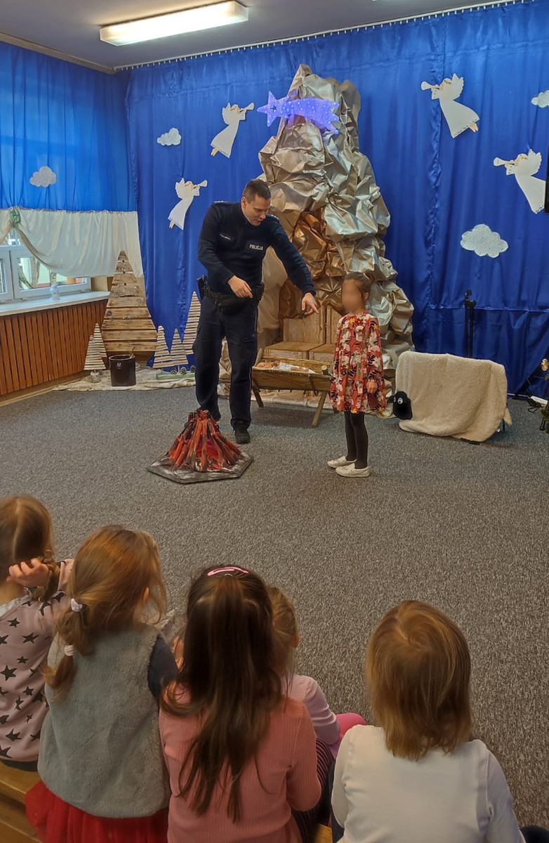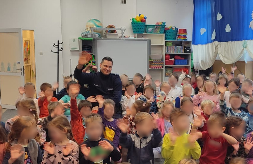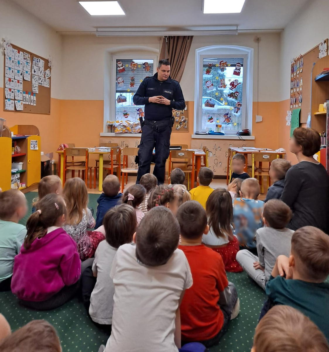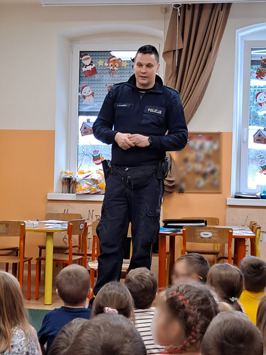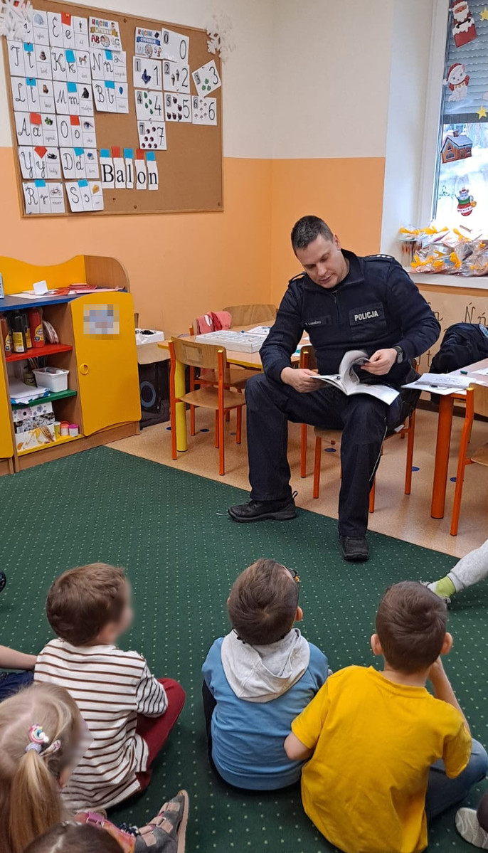 W środę (17.01.2024 r.) funkcjonariusz dzielnicowy z Posterunku Policji II spotkał się z dziećmi z przedszkoli na terenie Olsztyna, gdzie rozmawiał z najmłodszymi o bezpieczeństwie podczas ferii zimowych, a także na temat zagrożeń z jakimi mogą się spotkać podczas zimowego wypoczynku. Ciekawym urozmaiceniem działań profilaktycznych było czytanie dzieciom książeczki dla najmłodszych pod tytułem "Na ratunek Poli". Policjant rozmawiał z dziećmi na temat bezpiecznego spędzania czasu zimą i zabaw na śniegu, podczas których również należy zachować ostrożność. Policjant przypomniał najmłodszym zasady prawidłowego przechodzenia przez jezdnię oraz jak ważne jest noszenie elementów odblaskowych szczególnie zimą. Podczas spotkania dzieci uczyły się wskazywać zagrożenia jakie mogą spotkać na swojej drodze podczas zabaw w miejscach niedozwolonych, takich jak m.in. zamarznięte zbiorniki wodne. Nie mogło zabraknąć informacji na temat tego, czym jest numer alarmowy i w jakich sytuacjach należy dzwonić pod 112. Dzieci, jak zawsze chętnie, odpowiadały na pytania i brały udział w ćwiczeniach dotyczących bezpiecznych zachowań zimą.