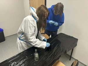 Studenci Wydziału Prawa i Administracji Uniwersytetu Warmińsko-Mazurskiego zrzeszeni w Kole Naukowym Kryminalistyki „Na Tropie” mogli w kontrolowanych warunkach przekonać się jak w praktyce wyglądają czynności w miejscu prowadzenia oględzin. Przy okazji przekonać się jak wiele wiedzy, umiejętności manualnych i doświadczenia potrzeba do tego, aby we właściwy sposób ujawnić i zabezpieczyć ślady pozostawione przez sprawcę przestępstwa.