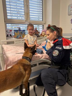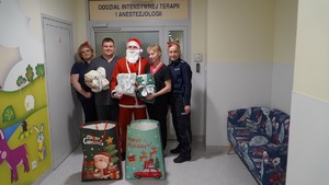 Policyjny Mikołaj i jego czworonożny pomocnik przekazali paczki tym dzieciom, które nie mogły opuścić swoich szpitalnych sal - pacjentom oddziału Onkologii i Hematologii. Oddział Intensywnej Terapii i Anestezjologii został wyposażony w kolorowe kocyki.