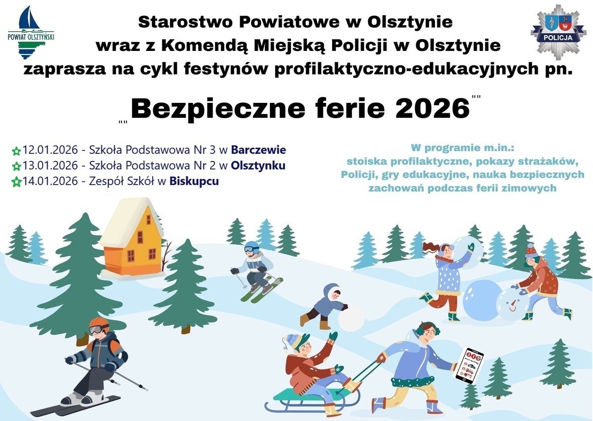 19 stycznia br. w województwie warmińsko-mazurskim rozpoczynają się ferie zimowe. To czas podróży, rekreacji zimowej, ale także odpoczynku od obowiązków szkolnych dzieci i młodzieży. Podczas aktywnego wypoczynku musimy jednak pamiętać o wielu zasadach bezpieczeństwa oraz o zdrowym rozsądku. Policjanci również przygotowują się do ferii zimowych organizując spotkania profilaktyczne i akcje poświęcone promowaniu bezpiecznych postaw podczas zimowego wypoczynku. Od 12 stycznia br. rusza cykl festynów profilaktycznych pn. „Bezpieczne ferie 2026".