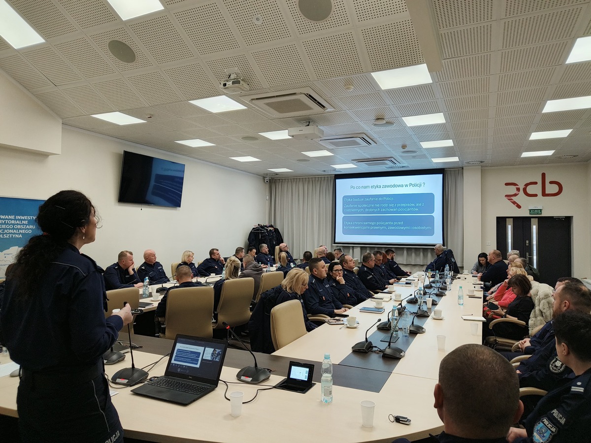 W czwartek (12.02.2026 r.) w sali konferencyjnej Regionalnego Centrum Bezpieczeństwa w Olsztynie odbyło się szkolenie kadry kierowniczej Komendy Miejskiej Policji w Olsztynie z zakresu standardów etycznych i praw człowieka. Szkolenie przeprowadziła podinsp. Dorota Rak Pełnomocnik Komendanta Wojewódzkiego Policji w Olsztynie ds. Ochrony Praw Człowieka. Spotkanie podzielone zostało na dwa moduły. Pierwszy z nich to "Etyka zawodowa, edukacja i świadomość jako kluczowe narzędzia przeciwdziałania mobbingowi i innym zachowaniom niepożądanym w Policji”.