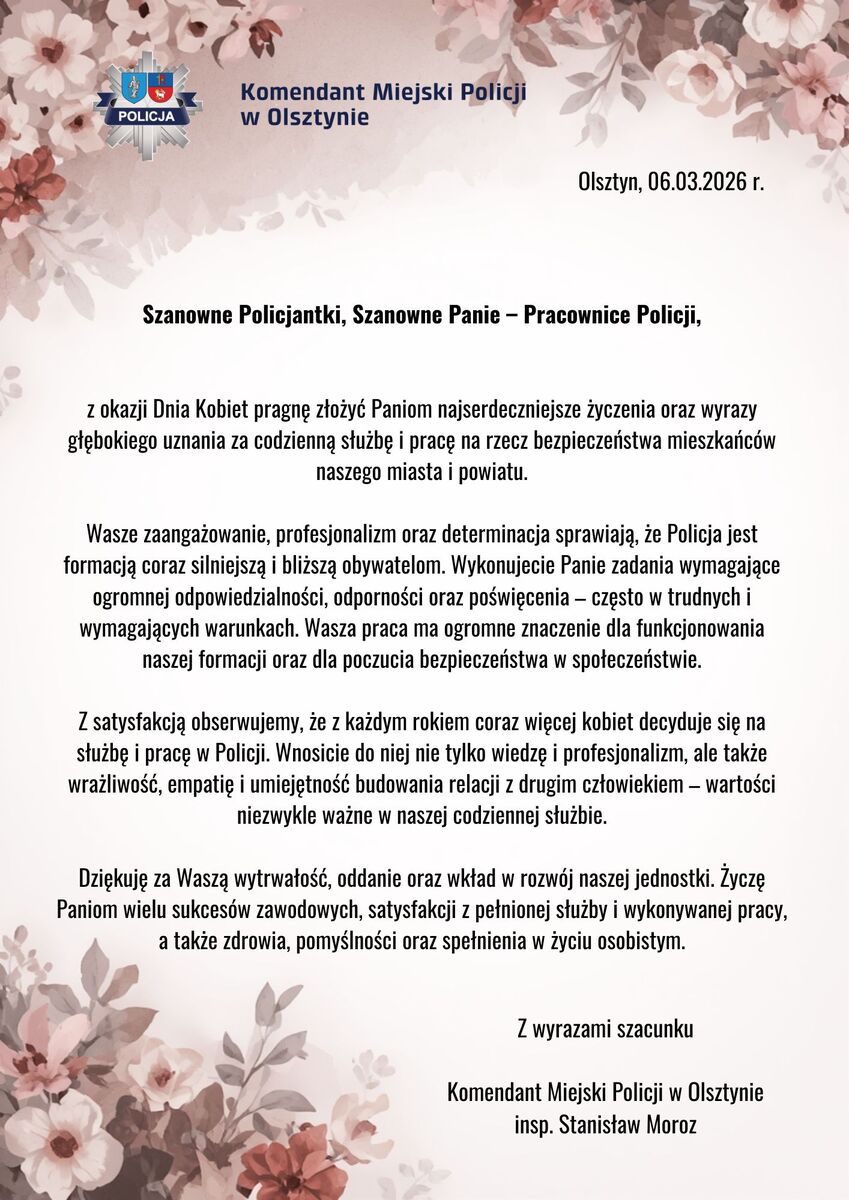 Życzenia Komendanta Miejskiego Policji w Olsztynie z okazji Dnia Kobiet