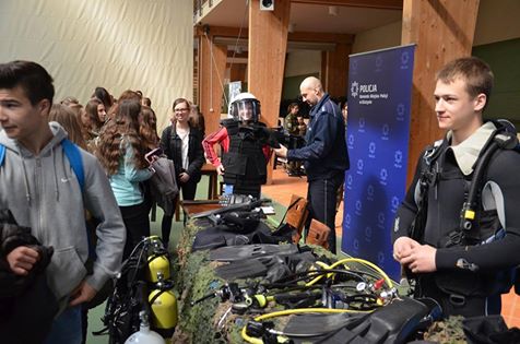 Do współpracy w organizacji Dnia Otwartego przyłączyli się funkcjonariusze Komendy Miejskiej Policji w Olsztynie, którzy od kilku lat wspierają Szkołę w realizacji programu nauczania, zapoznając uczniów ze specyfiką, zadaniami i podstawowymi umiejętnościami niezbędnymi w służbie policyjnej. Policjant z Wydziału Prewencji opowiadał uczestnikom o dotychczasowej współpracy Szkoły z jednostką Policji, a także wyjaśniał przyszłym licealistom, jakie profity przewidziane są dla absolwentów klas o profilu mundurowym, którzy zdecydują się w przyszłości wstąpić w szeregi Policji. Ponadto w związku z tym, iż Dzień Otwarty w olsztyńskim Liceum CN-B zbiegł się terminowo z Młodzieżowym Dniem Przedsiębiorczości, wszystkim, którzy odwiedzili tego dnia mury Szkoły, funkcjonariusz przybliżał procedurę doboru kandydata do służby w Policji, a także omówił strukturę organizacyjną olsztyńskiej Komendy.