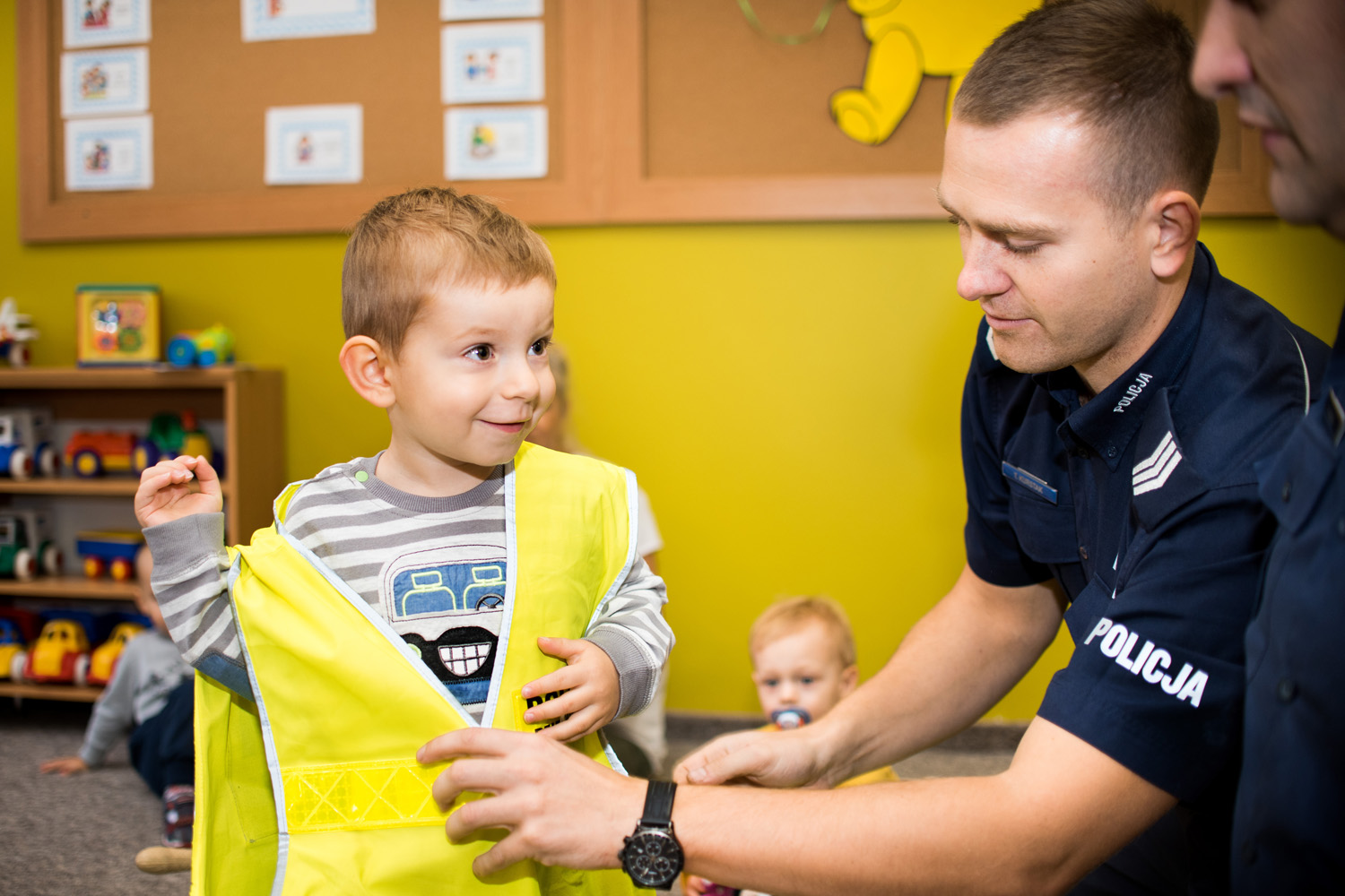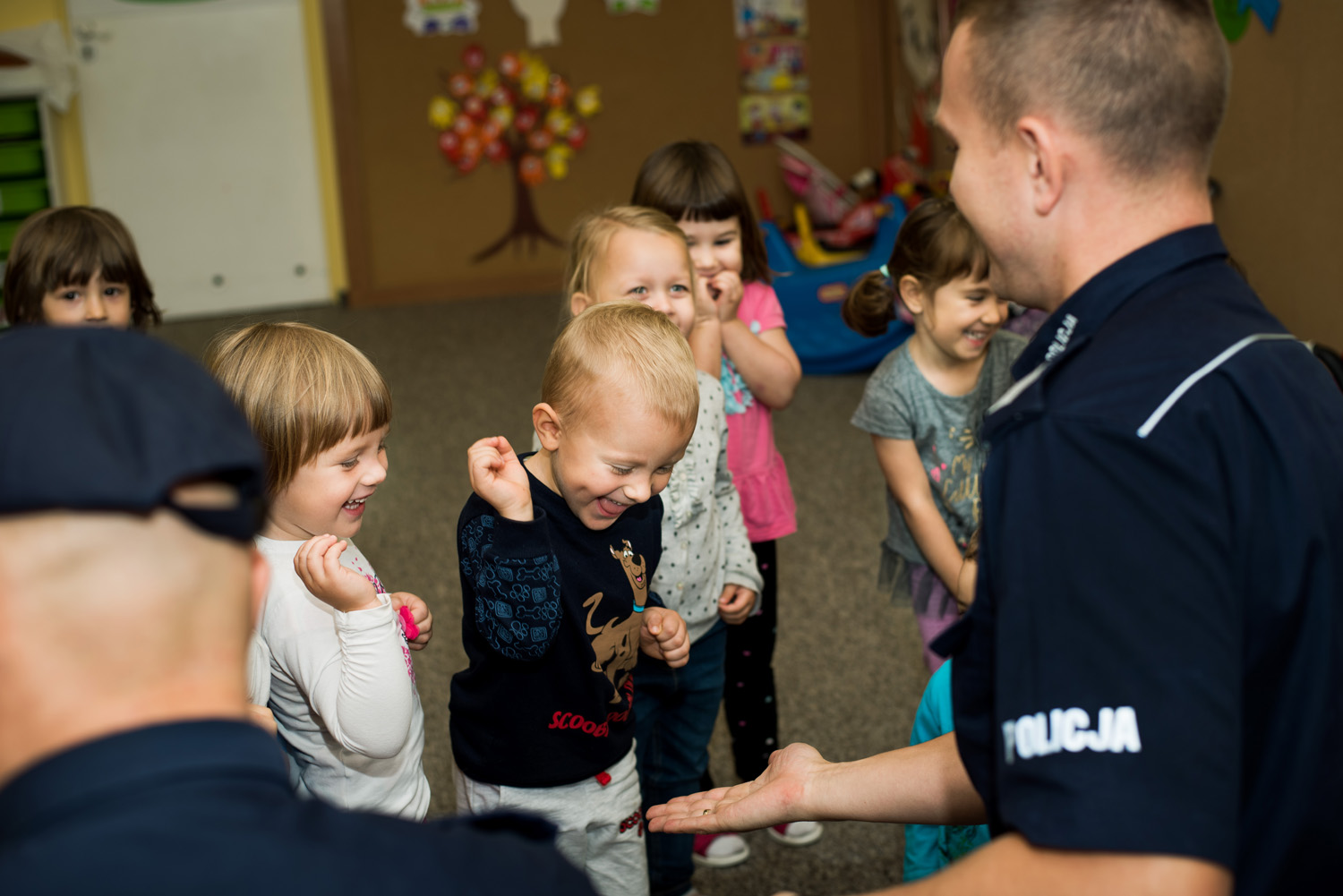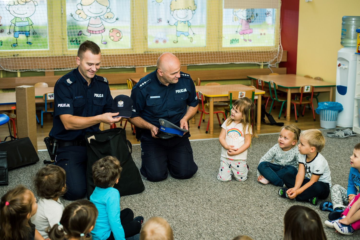 Funkcjonariusze Policji opowiedzieli maluchom o swojej codziennej pracy - wyjaśnili, jakie zadania spoczywają na policjantach, kiedy pomoc Policji jest niezbędna i w jaki sposób funkcjonariusze pilnują bezpieczeństwa dzieci i dorosłych mieszkańców. Ogromną atrakcją dla przedszkolaków była możliwość poznania nazw poszczególnych elementów policyjnego umundurowania, tym bardziej, że dzieci ucząc się ich funkcji mogły te elementy oglądać, dotykać, a niektóre nawet przymierzać. I wyglądały w nich fantastycznie!