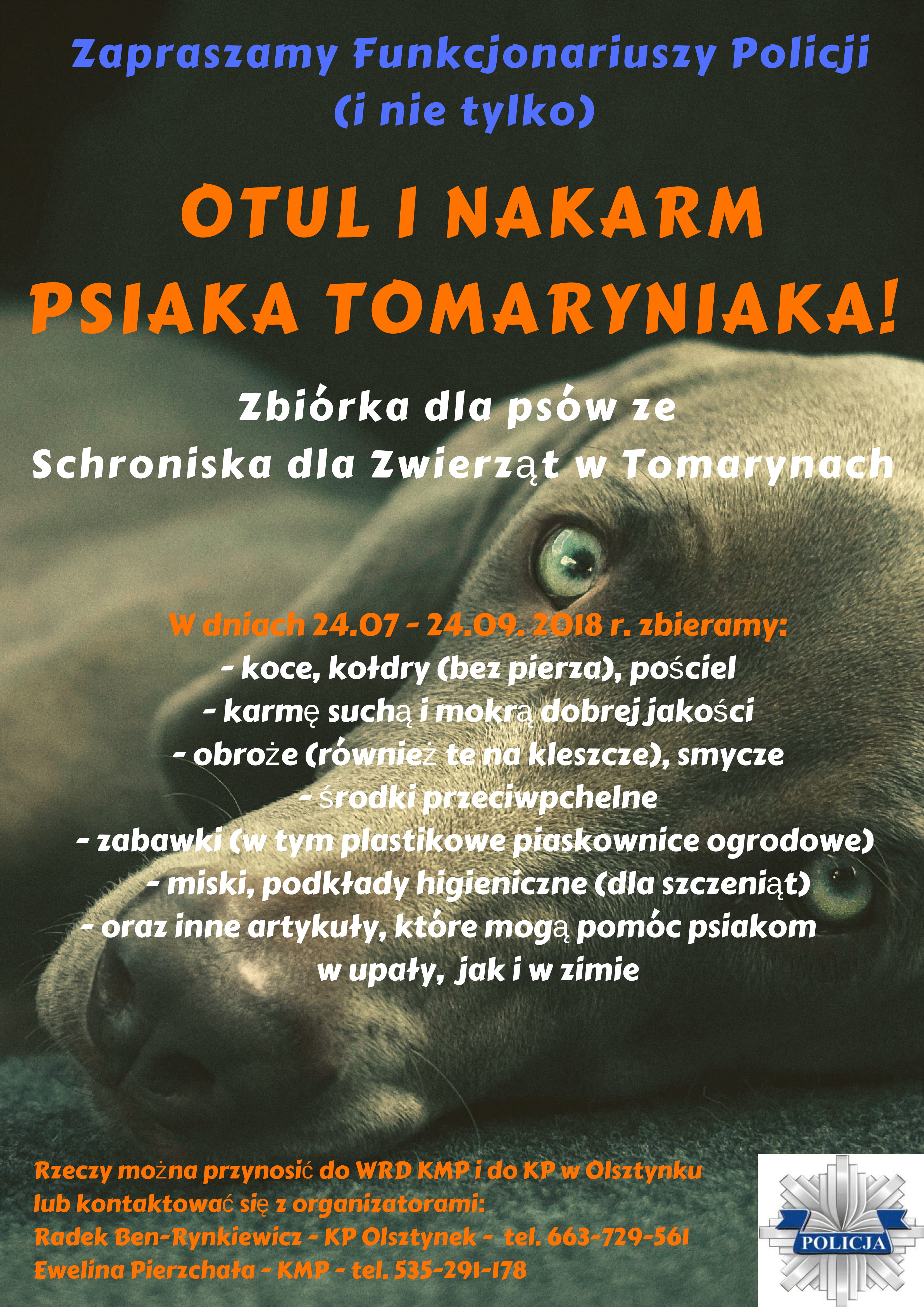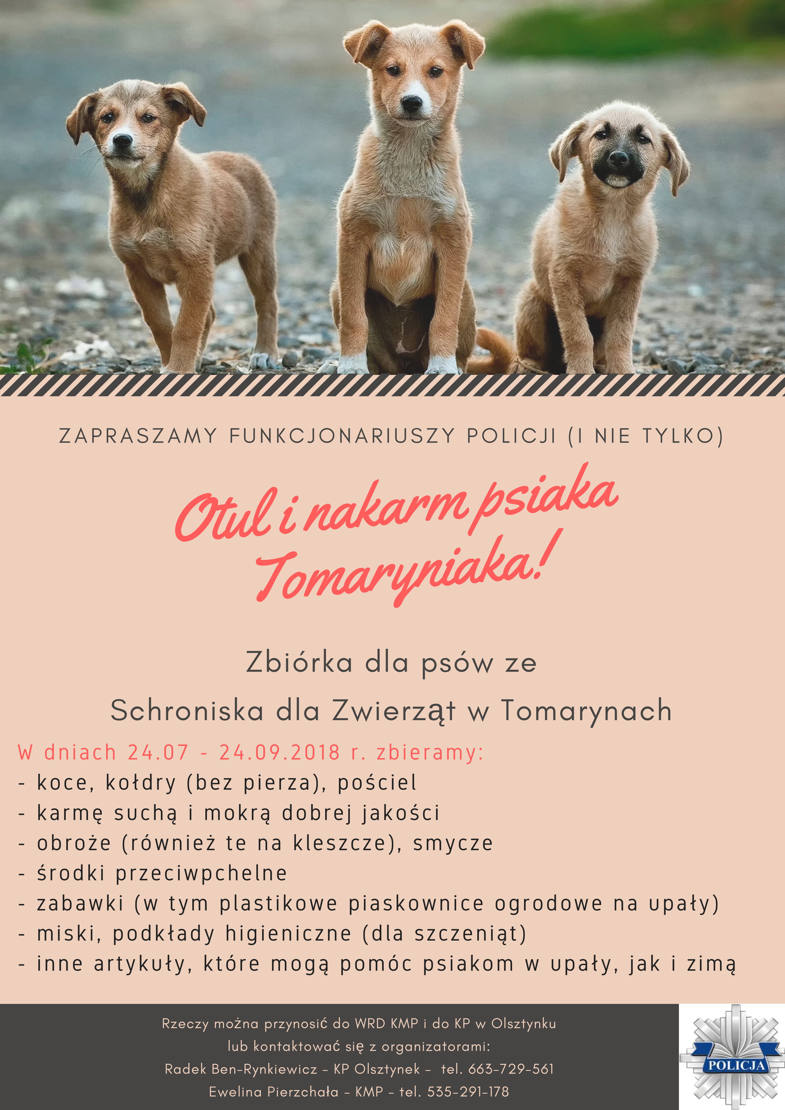 St. sierż. Ewelina Pierzchała z KMP w Olsztynie i sierż. szt. Radosław Ben-Rynkiewicz na co dzień pełniący służbę w KP w Olsztynku, są inicjatorami akcji mającej na celu wsparcie i tak ciężkiego żywota zwierząt przebywających w schronisku. To nie pierwsza akcja charytatywna, którą funkcjonariusze zarażają swoich kolegów z pracy i nie tylko. Tym razem policjanci starają się wesprzeć los psiaków przebywających w schronisku w Tomarynach.