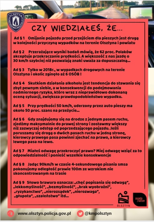 Autorski projekt olsztyńskiej policji. Nasza postawa za kierownicą, sposób odnoszenia się i traktowania innych użytkowników dróg, a także podejście do przepisów drogowych, tworzy KULTURĘ BEZPIECZEŃSTWA na naszych drogach. W związku ze zbliżającymi się Świętami Wielkanocnymi i zwiększonym natężeniem ruchu, olsztyńska policja apeluje o zachowanie wyjątkowej KULTURY na drogach oraz stosowanie się do stworzonego na kanwie przepisów Kodexu Odpowiedzialnego Kierowcy