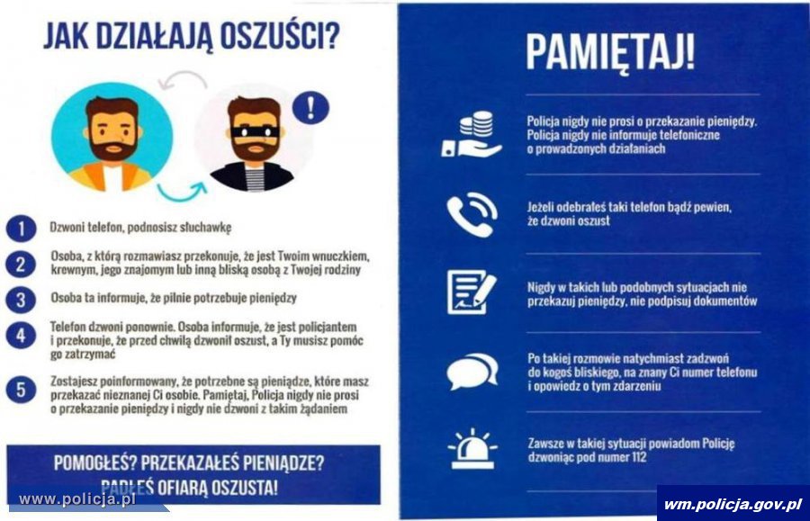 W trosce o oszczędności starszych osób Policja apeluje o szczególną ostrożność oraz o stosowanie zasady ograniczonego zaufania podczas rozmów telefonicznych, dotyczących pożyczek lub przekazania pieniędzy. Przede wszystkim należy zachować ostrożność – jeżeli dzwoni do nas ktoś, kto podszywa się pod członka naszej rodziny i prosi o pieniądze, nie podejmujmy żadnych pochopnych działań. Nie informujmy nikogo telefonicznie o ilości pieniędzy, które mamy w domu lub przechowujemy na koncie. Nie wypłacajmy z banku wszystkich oszczędności. Zadzwońmy do kogoś z rodziny, zapytajmy o to czy osoba, która prosiła nas o pomoc, rzeczywiście jej potrzebuje. Pamiętajmy, że nikt nie będzie nam miał za złe tego, że zachowujemy się rozsądnie. Nie ulegajmy presji czasu wywieranej przez oszustów. W przypadku podejrzenia, że możemy mieć do czynienia z oszustem należy natychmiast skontaktować się z najbliższą jednostką Policji osobiście lub telefonicznie dzwoniąc pod nr 112.